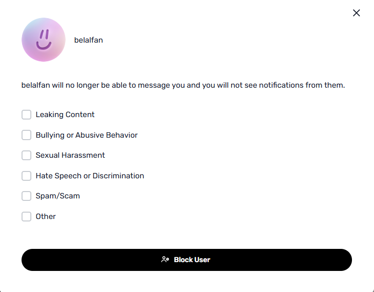 - Creator Block Reporting Workflow: When a creator blocks a fan, they are prompted to complete a form stating the reason. If the reason is "Leaked Content," the report is forwarded directly to Customer Service.