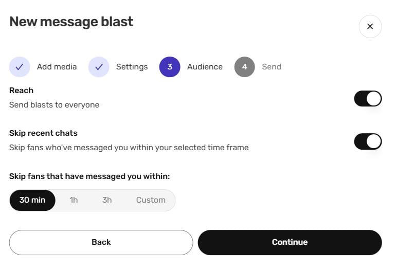 - New Message Blast Modal: Along with a refreshed design, creators can now exclude recent conversations when sending a message blast. This ensures fans don't receive unpersonalized messages in the middle of a conversation.