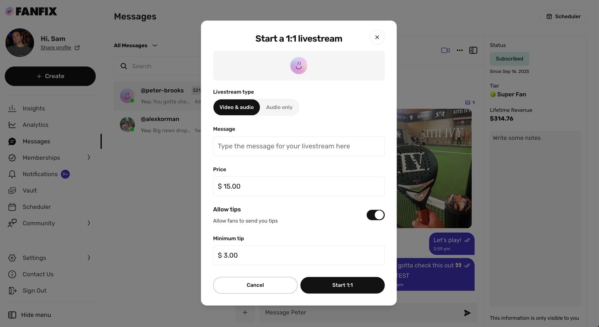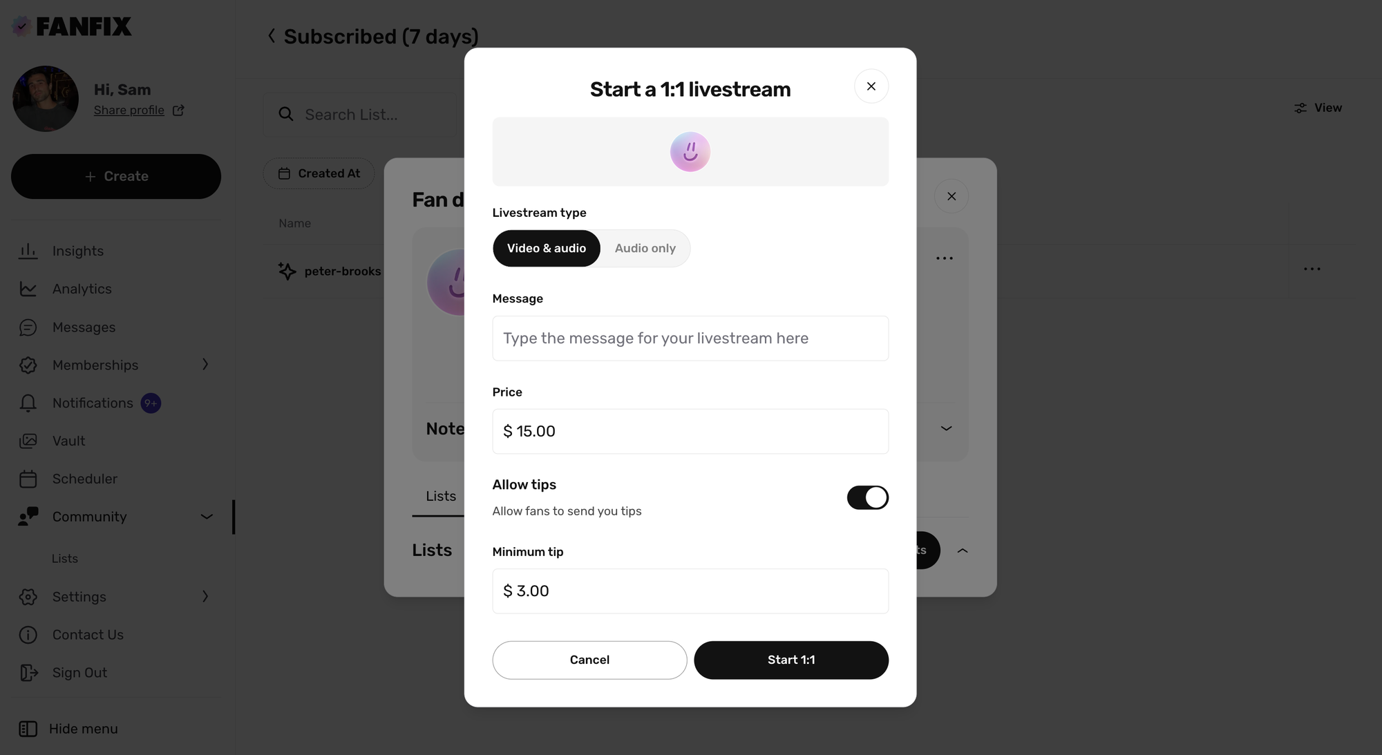 - Click the camera icon or 'Start 1:1', then choose video or audio, add a message, set the price, and decide if you want to allow tips.