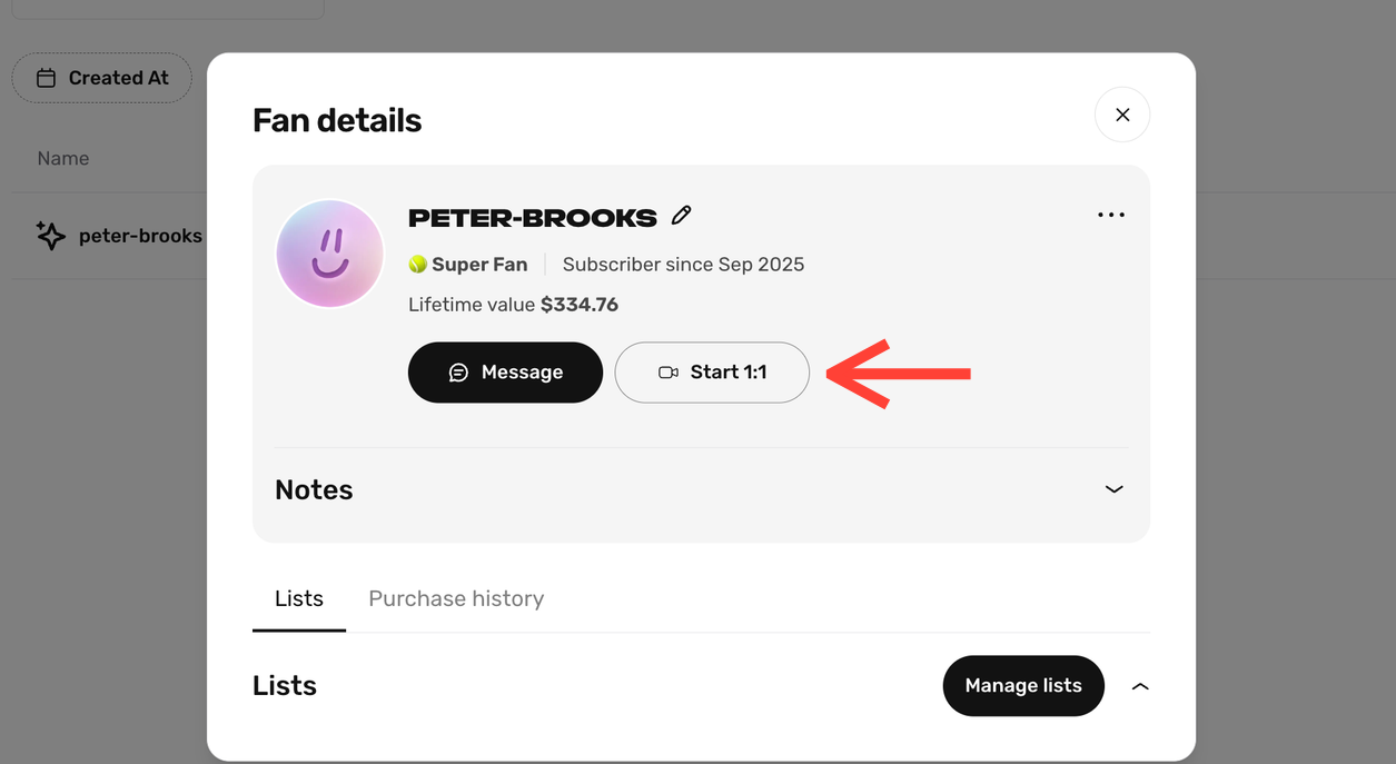 - Click 'Start 1:1' to send your invitation — the fan will get a notification to join.