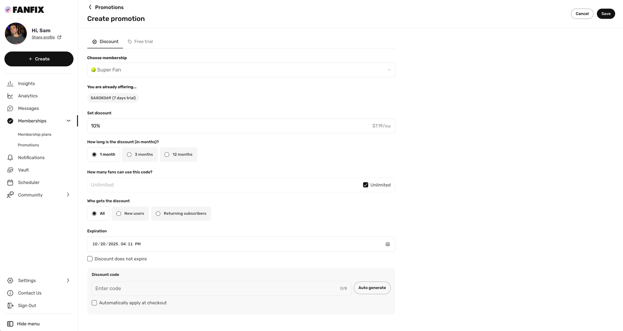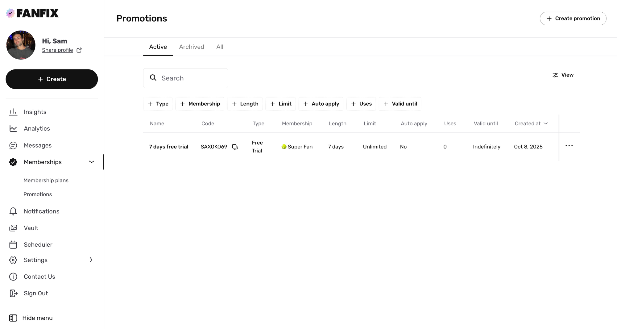 - Go to your Fanfix dashboard → Memberships → Promotions