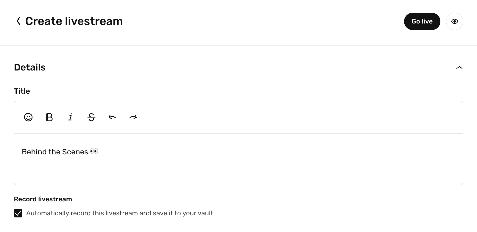 When setting up a livestream, simply toggle on: βAutomatically record this livestream and save it to your vault.β